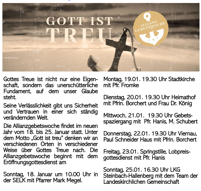 Posaunenchor und Lobpreischor in Herges-Hallenberg, Kindergottesdienst in Bermbach, Kindertreffs in Springstille und Mittelstille, Konfi-Unterricht, Bibeltreff bei Wein und Snacks, Frauentreffs in Breitenbach, Springstille und Herges, 3-Minuten-Predigten als Videos aufs Handy und vieles mehr. Infos bei Pfarrer Uwe.